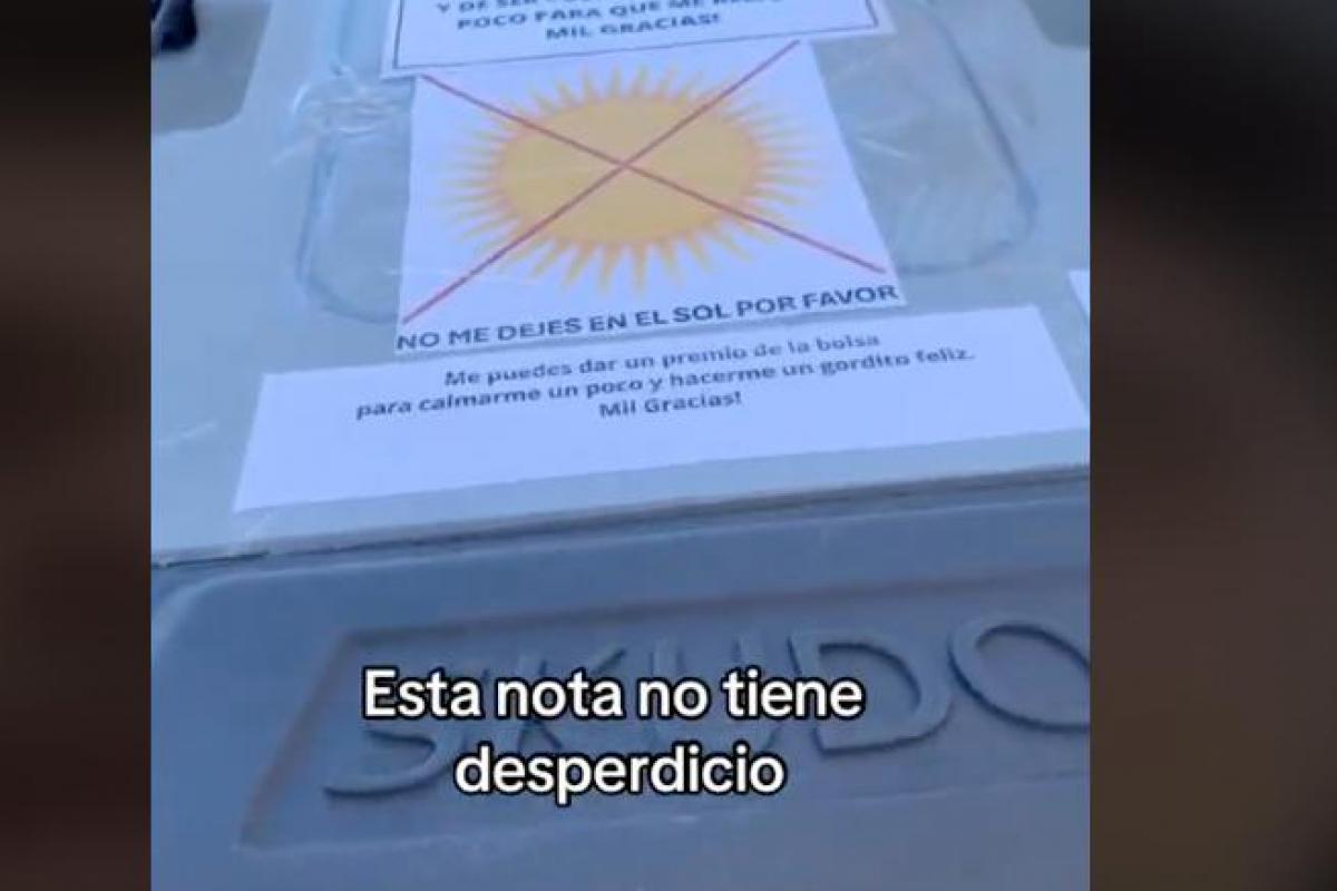 "No me dejes en el sol por favor", se puede leer debajo junto a un sol radiante. Además, hay un último mensaje: "¿Me puedes dar un premió de la bolsa para calmarme un poco y hacer me un gordito feliz?".