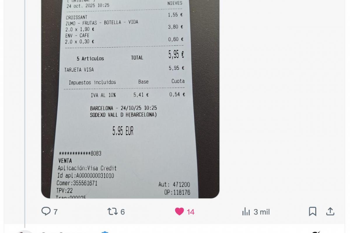 Se indigna por el cobro que le han hecho en la cafetería del hospital Vall d'Hebron de Barcelona y hasta FACUA interviene
