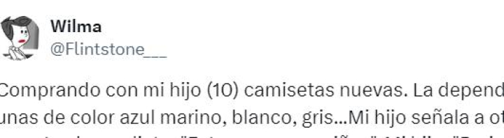"Comprando con mi hijo camisetas nuevas, la dependienta le enseña unas de color azul marino, blanco, gris...", ha explicado al principio de la publicación en la red social X, antes conocida como Twitter, que ha acumulado más de 300.000 reproducciones y 17.000 'me gusta' en apenas 24 horas.