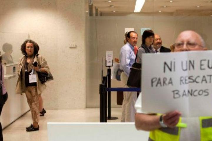 En Madrid, una decena de "yayoflautas", constituidos en asociación hace un mes, han protestado dentro de una oficina de Bankia de la capital por el rescate de este banco "con dinero público" y para reclamar que los derechos que los ciudadanos han conseguido en los últimos treinta años no les sean arrebatados con la "excusa" de la crisis económica.