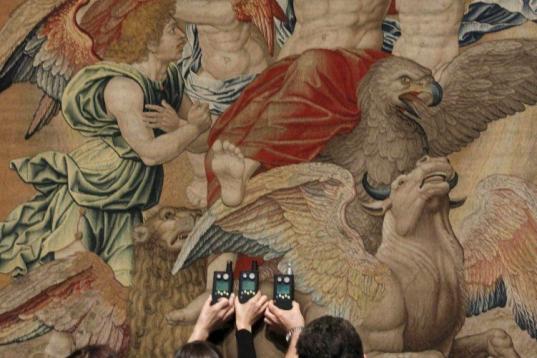 Tres técnicos realizan mediciones sobre el tapiz de Rafael