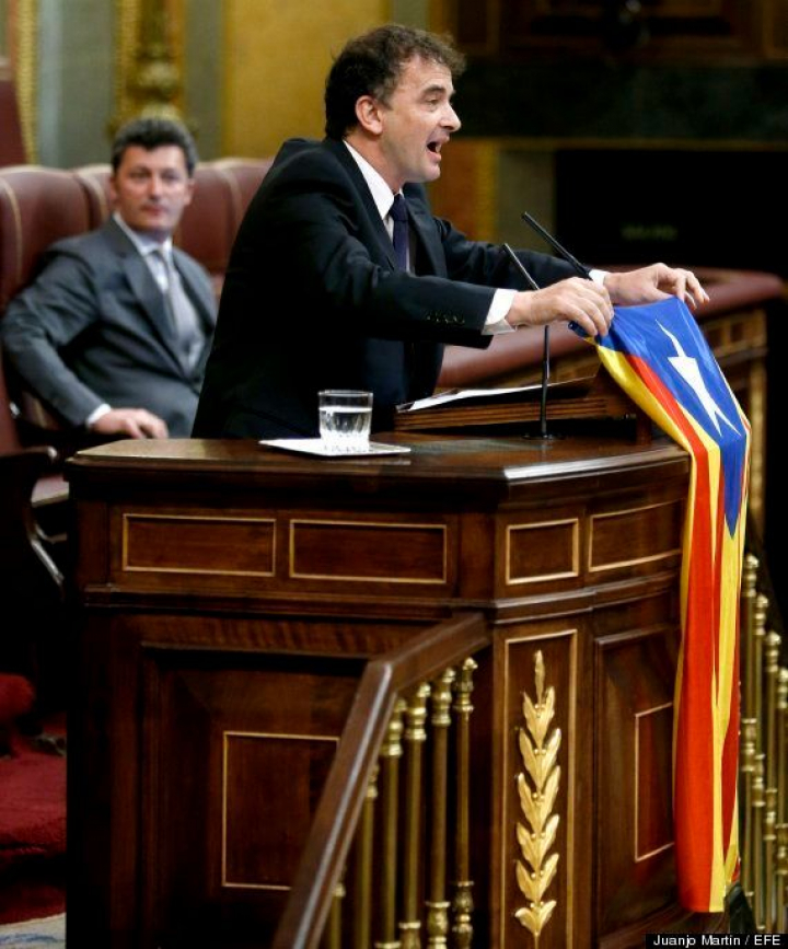 En un momento de su alocución, cuando el republicano catalán estaba apuntando que con esta iniciativa lo que el PP busca "no es combatir el odio y la violencia" en los espectáculos deportivos o separar la política del deporte, sino la exhibición de banderas como la bandera independentista catalana.