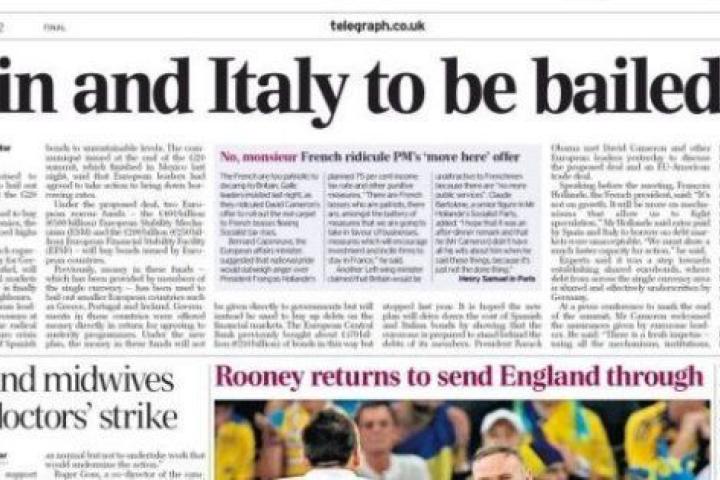 El diario británico The Telegraph asegura en su portada de este miércoles que los líderes europeos ultiman un acuerdo para prestar asistencia financiera por importe de unos 750.000 millones a España e Italia a través de los fondos disponibles en el Fondo Europeo de Estabilidad Financiera (FEEF) y del Mecanismo Europeo de Estabilidad (Mede), que serían empleados en la compra de deuda soberana.