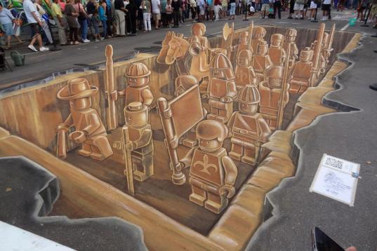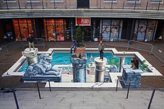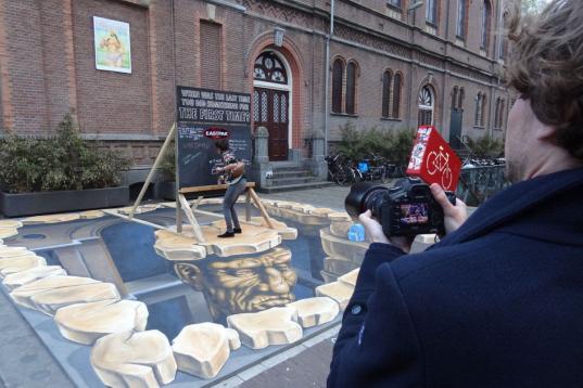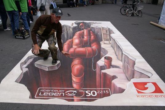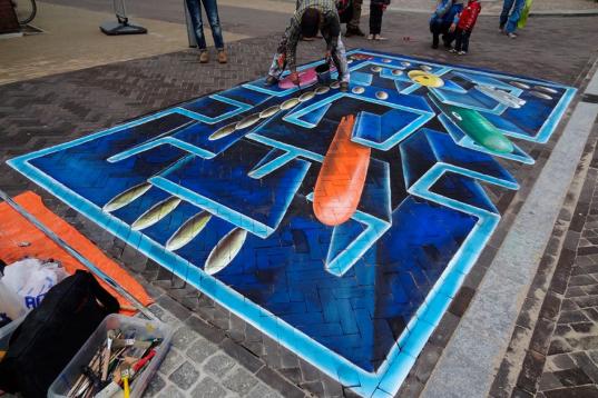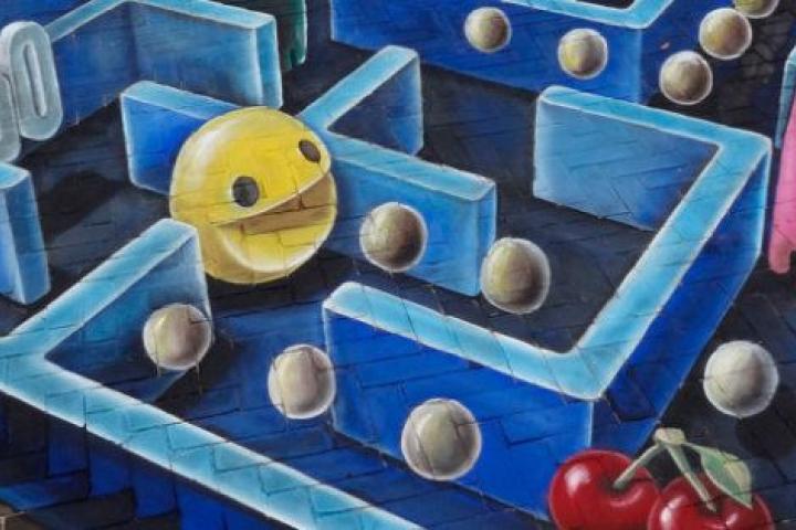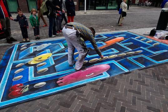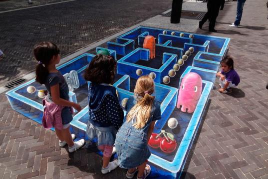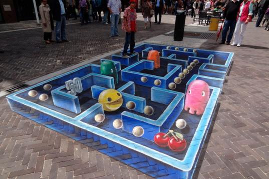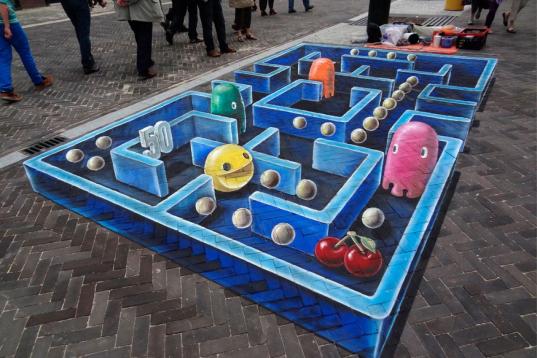 El artista urbano holandés Leon Keer ha realizado una pintura de efecto 3D en el suelo en la ciudad de Venlo (Holanda). Para ello se ha inspirado en el mítico videojuego Come-cocos o Pac-Man. Keer suele presentar sus obras en la calle para poder compartirlas y disfrutarlas con el público.