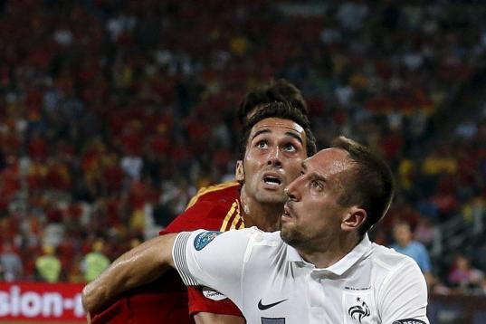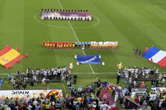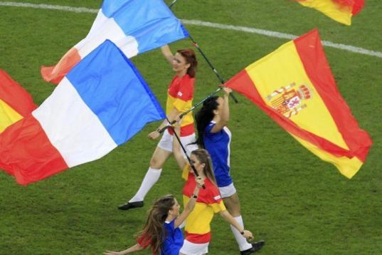 Los de Del Bosque comenzaron dominando el encuentro con toque y llegadas directas a través de Silva e Iniesta. Francia lo intentaba desde el costado izquierdo con Ribery y Benzema, pero sólo al contragolpe. El resto del defensivo equipo planteado por Blanc se quedaba replegado esperando a España.