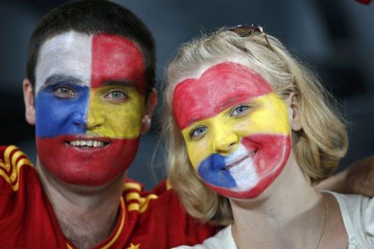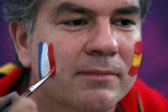 Dos aficionados, con las caras pintadas con la mezcla de colores franceses y españoles.