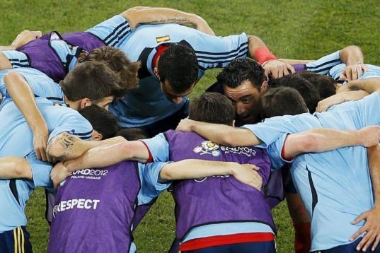 Los jugadores de la selección española hacen una piña antes del partido.