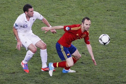 Iniesta se adelanta a Reveillere para controlar el balón.