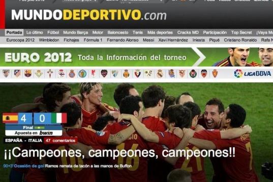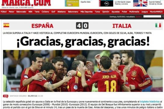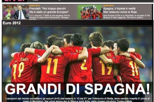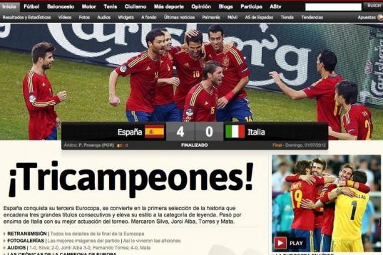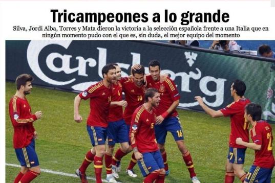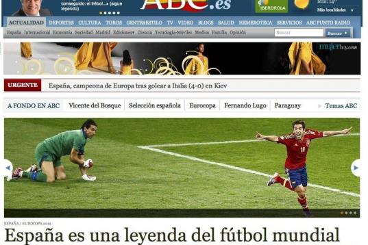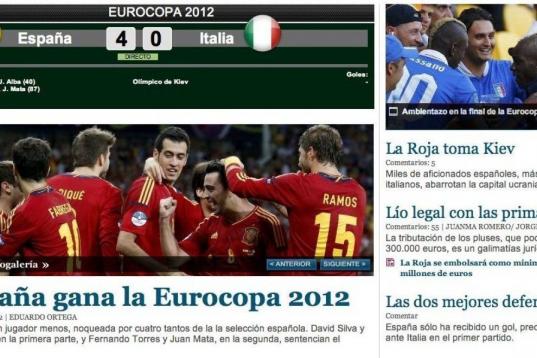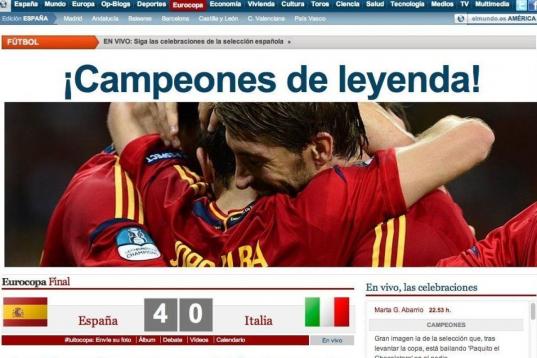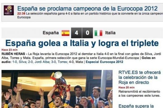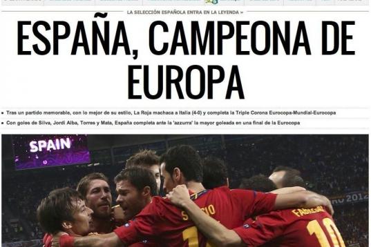 Lo peor de que la selección española de fútbol gane tantos títulos es que se terminan los calificativos y los titulares. Aquí os dejamos una muestra de cómo han recogido los distintos medios de comunicación online la victoria de España en la Eurocopa.