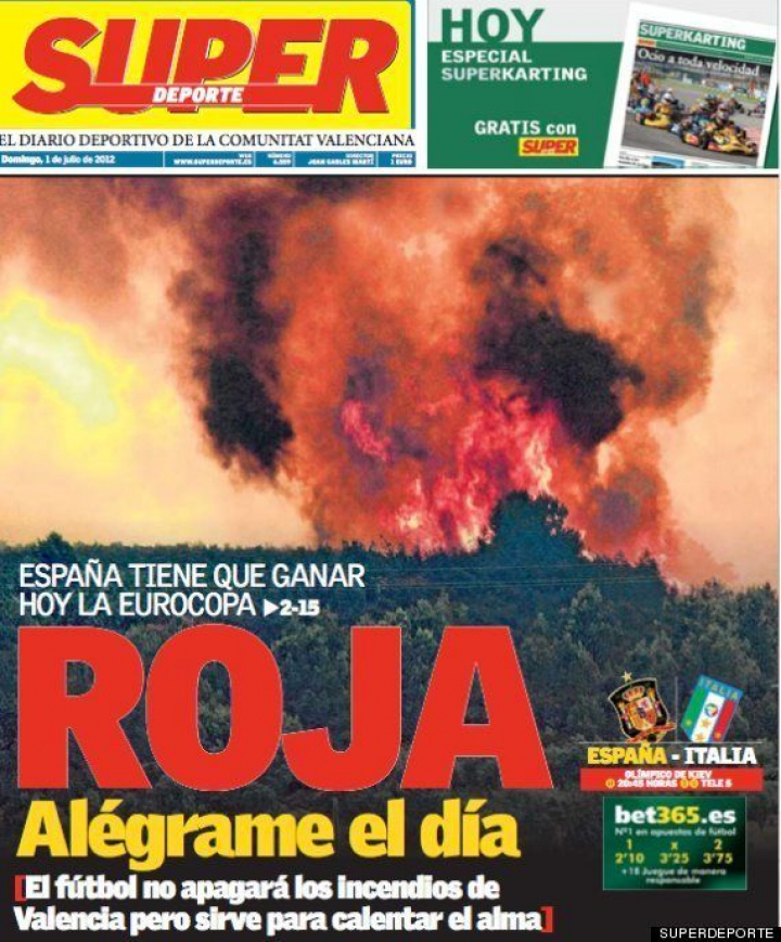 El redactor jefe del periódico deportivo de la Comunidad valenciana Superdeporte, Carlos Bosh, ha pedido disculpas por la portada de la edición del pasado domingo, día en el que se disputó la final de la Eurocopa 2012, en la que se impuso España a Italia por 4-0. Sobre un fondo con los incendios de Valencia, aparecía el titular: "Roja, alégrame el día. El fútbol no apagará los incendios de Valencia, pero sirve para calentar el alma".