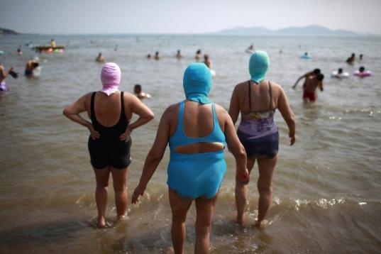 Si creías que con el burkini ya lo habías visto todo, deberías saber que lo último entre las señoras chinas que van a la playa en Qingdao, en la provincia costera china de Shandong, es llevar unas máscaras de nylon de colores que les cubren prácticamente toda la cara, con apenas unos orificios para los ojos, nariz y boca. El objetivo de la extravagante moda: proteger sus rostros totalmente de los rayos del sol.