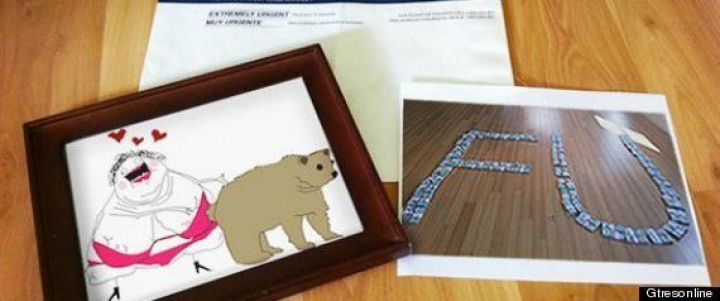 Estas son otras de las fotos que ha compartido el autor de The Oatmeal. Incluye la suya, la de el envío que prepara para el dueño de la web FunnyJunk y una caricatura con billetes de la madre de este.