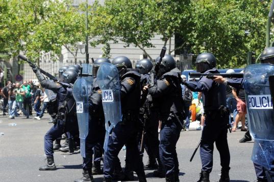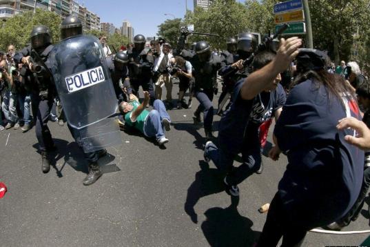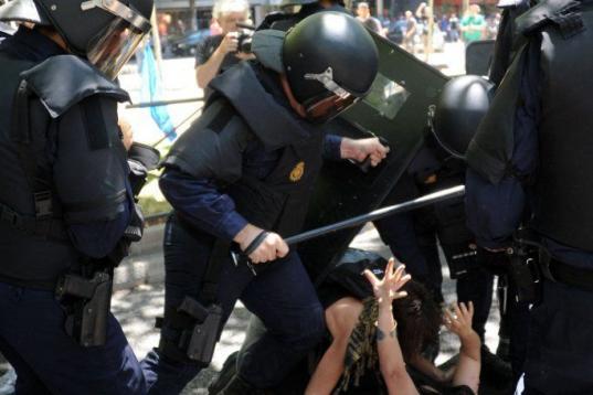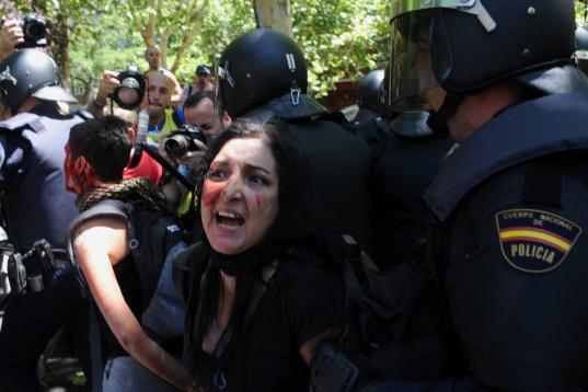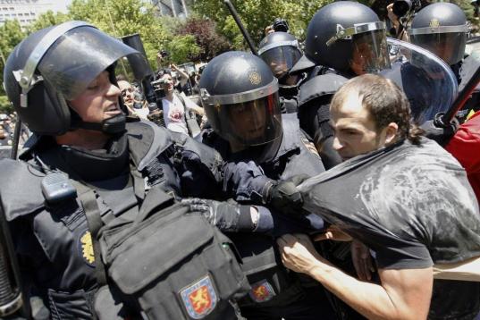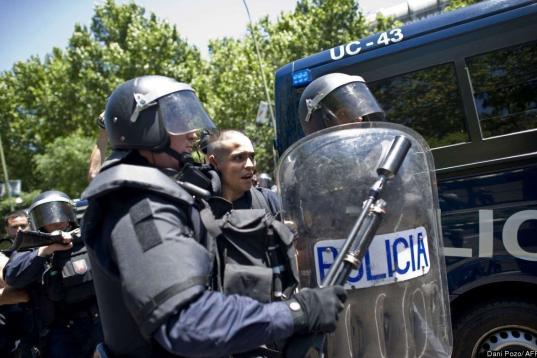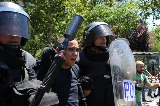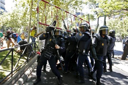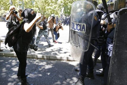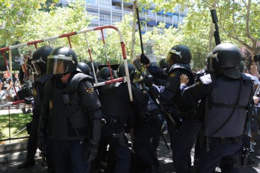 Llegados delante del Ministerio de Industria, hacia las 13:30, varios manifestantes han empezado a abuchear a los agentes antidisturbios que protegían la sede. Algunos asistentes han empezado a taparse las caras y romper aceras en pedazos. El ambiente cada vez se iba caldeando más y los concentrados han arrojado diversos objetos, piedras y petardos a los agentes.