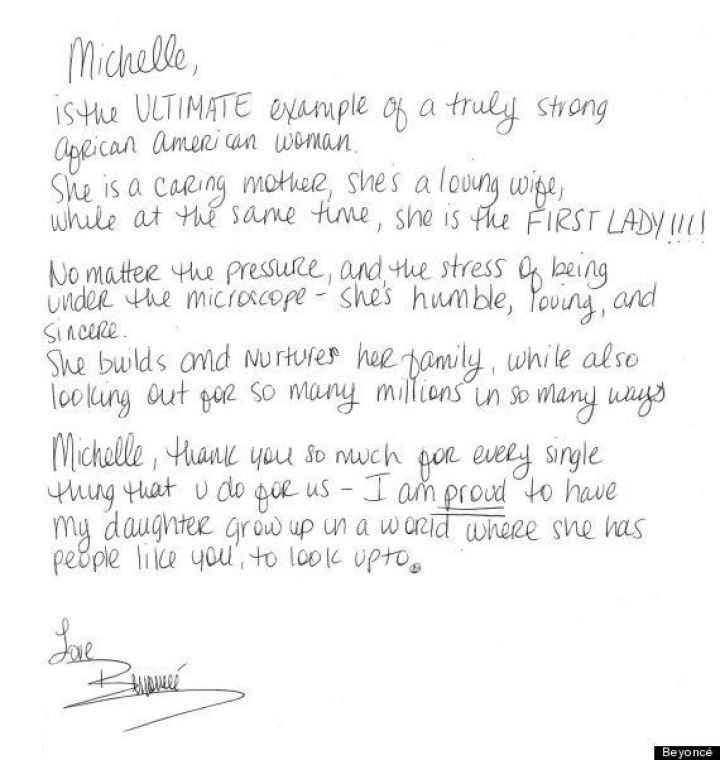 La primera dama llevó a sus hijas a un concierto de Beyoncé el pasado mayo. La cantante ha querido ahora tener un gesto con ella y le ha escrito una carta abierta, que luego ha leído para el vídeo, en el que resalta sus cualidades como madre y esposa "al mismo tiempo que es la primera dama" y señala que, pese a toda la presión que soporta, es "humilde, cariñosa y sincera". Además, le dice que está "orgullosa" de poder criar a su hija -Blue Ivy, que nació a principios de año- en un mundo en el que hay personas como ella.
