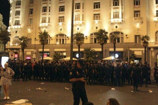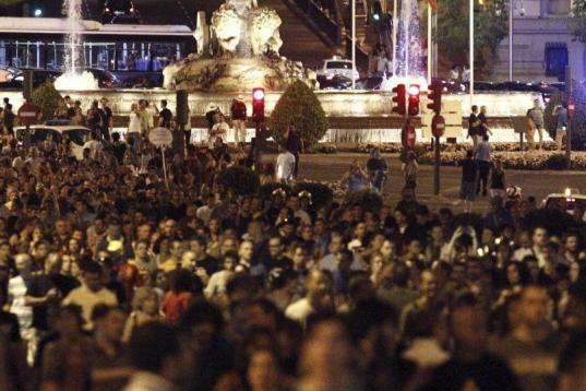 Sobre las 11.20 horas, algunos de ellos han conseguido cortar la Gran Vía y se han dirigido a la Plaza de Cibeles, donde han coincidido con el 'cortejo fúnebre' convocado por los empleados municipales del Ayuntamiento de Madrid, que vestidos de luto han presidido el simbolico "entierro" de los funcionarios públicos.