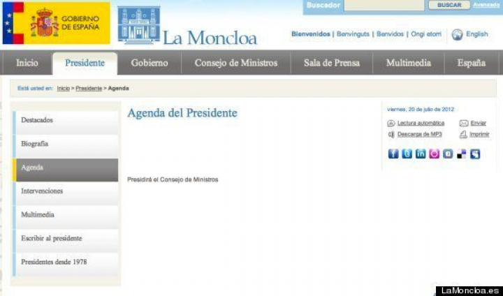 En la agenda de Rajoy en la web de La Moncloa no se aprecia que el jefe del Ejecutivo tenga ninguna tarea programada para hoy, simplemente aparece la reunión del Consejo de Ministros de este viernes. De hecho, desde la propia Moncloa reconocen que no tenía acto alguno que coincidiera con el debate. ¿Entonces? "No es por razones de agenda. No sabemos por qué. Algún motivo tendrá", aseguran.
