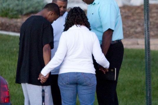 A small group prays outside Gateway High School where witness were brought for questioning Friday, July 20, 2012 in Aurora, Colo. A gunman wearing a gas mask set off an unknown gas and fired into the crowded movie theater killing 12 people and ...
