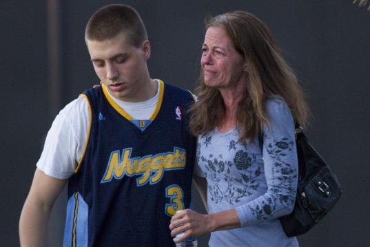 Eyewitness Jacob Stevens, 18, hugs his mother Tammi Stevens after being interview by police outside Gateway High School where witnesses were brought for questioning Friday, July 20, 2012 in Aurora, Colo. A gunman wearing a gas mask set off an ...