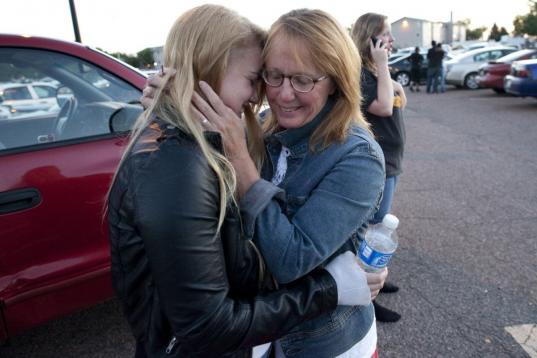 Emma Goos, 19, hugs her mother, Judy Goos, outside Gateway High School where witnesses were brought for questioning Friday, July 20, 2012, in Aurora, Colo. Emma was in the third row of the theater of the new Batman movie when the shooter entered...