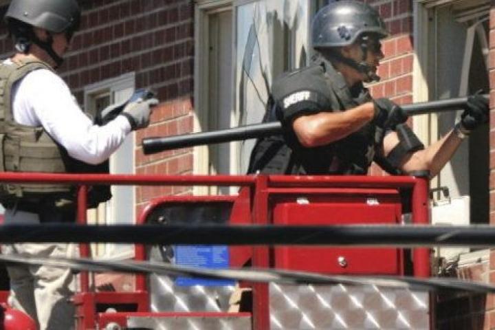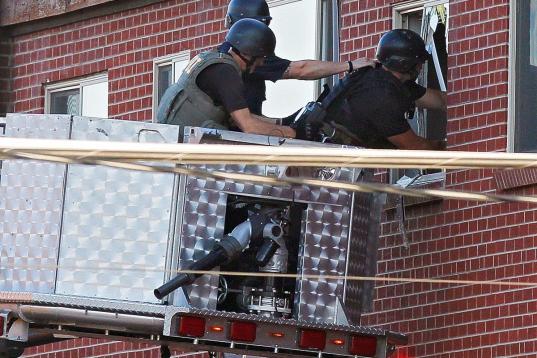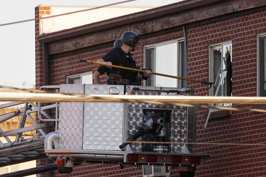 Police break out a window of an apartment where the suspect in a shooting at a movie theatre lived in Aurora, Colo., Friday, July 20, 2012. As many as 12 people were killed and 50 injured at a shooting at the Century 16 movie theatre early Frid...