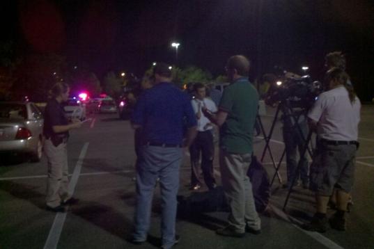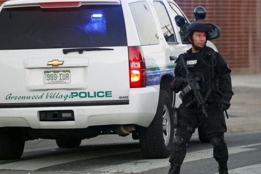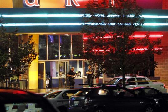 Police are pictured outside of a Century 16 movie theatre where as many as 12 people were killed and many injured at a shooting during the showing of a movie at the in Aurora, Colo., Friday, July 20, 2012. (Photo credit: AP Photo/Ed Andrieski)