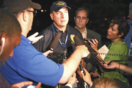 Aurora Police Chief Daniel Oates talks to media at Aurora Mall where as many as 12 people were killed and many injured at a shooting at the Century 16 movie theatre in Aurora, Colo., Friday, July 20, 2012. (Photo credit: AP Photo/Ed Andrieski)