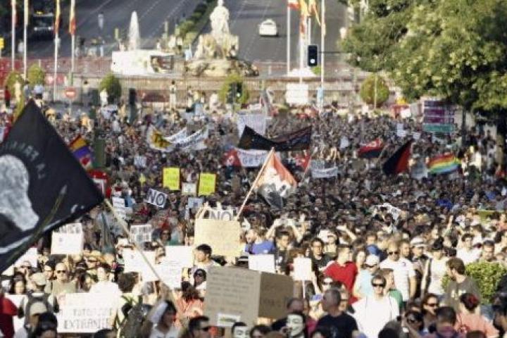 Después de concentrarse delante de la sede ministerial, donde gritaron a favor de la unión del pueblo, los manifestantes comenzaron a avanzar por un carril de la calzada lateral del Paseo de la Castellana acompañados por varios coches policiales. La protesta arreciaba cuando los manifestantes pasaban delante de oficinas de entidades financieras, donde acusaron a sus responsables de "ladrones" y clamaron a favor de la lucha obrera.