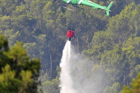 Un helicóptero descarga agua en un bosque de la localidad de Boadella