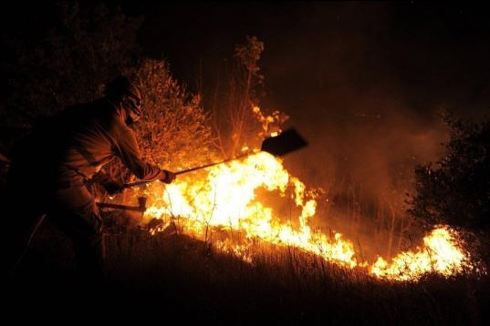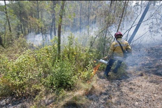 Un bombero enciende un cortafuegos en un bosque entre las localidades de Boadella y Terrades