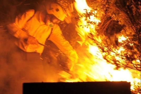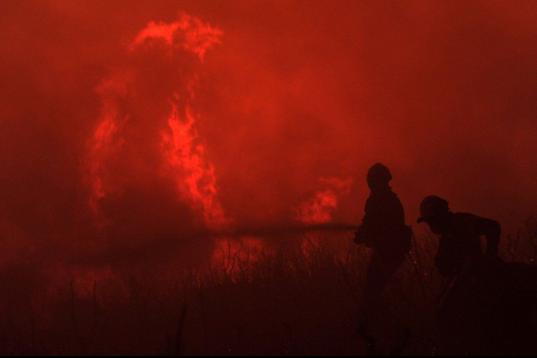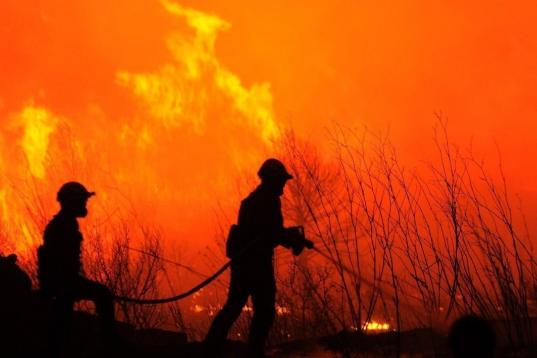 Dos bomberos intentan alcanzar el fuego con su manguera