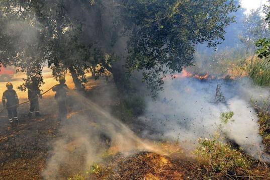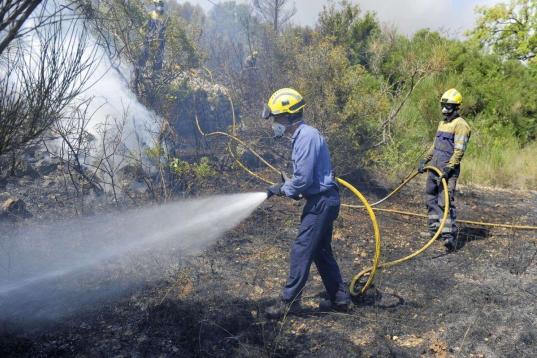 Dos bomberos rocían con agua la vegetación quemada, en los alrededores de La Jonquera.