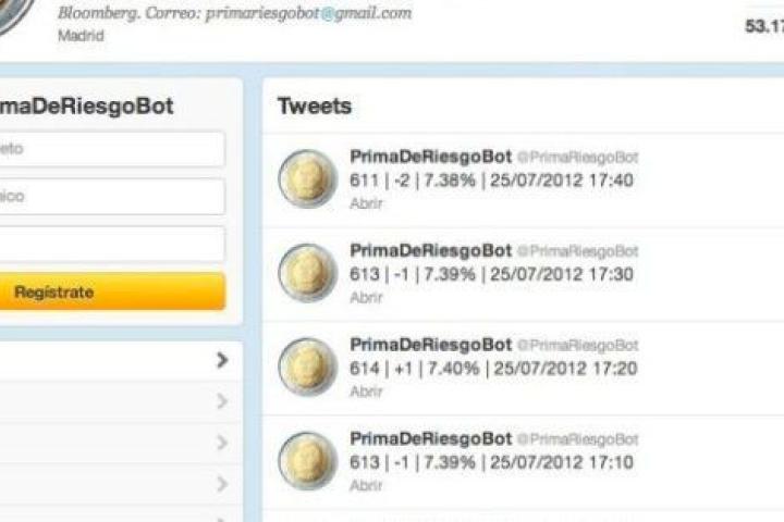 La idea partió de Kurioso, un usuario de la red social Twitter. ¿Por qué nadie ofrece información en tiempo real de la prima de riesgo española? David Fernández, que se autodefine de Librero 3.0, recogió el guante. En apenas unas horas lo tenía preparado: “El desarrollo tecnológico es una tontería, con con un nivel medio de programación se hace, es muy sencillo”, comenta el responsable de @primaderiesgobot, una página en Twitter que, cada diez minutos y de forma automática, lanza un mensaje con el valor de la prima de riesgo y el diferencial con el bono alemán a diez años.