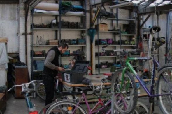 El local donde ambos amigos se encuentran es un espacio de unos 100 metros cuadrados atestado de piezas y herramientas de lo más diversas. En sus paredes, cubiertas de estanterías, se amontonan en impecable orden cajas llenas de cadenas, tornillos, sillines, tuercas... todas perfectamente etiquetadas. Las ruedas, de todos los tamaños, tampoco faltan.