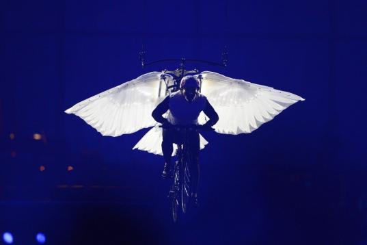 Una hermosa coreografía de 'palomas' de la paz sobre bicicletas que alzaron el vuelo en el estadio olímpico.
