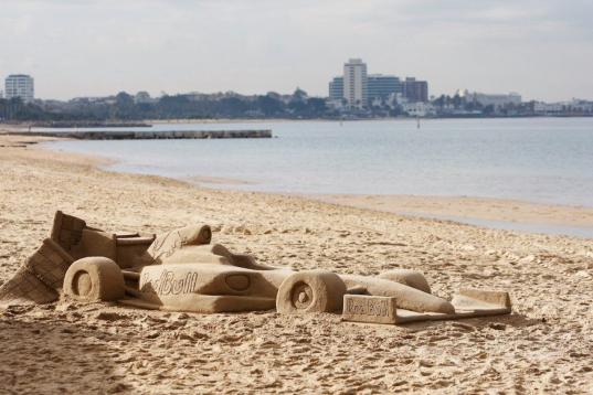 Este coche de carreras de Red Bull fue elaborado en la playa de St. Kilda, en Melbourne (Australia) durante el Gran Premio de Australia de Fórmula 1, en marzo de 2009.