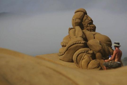 Un artista da los últimos retoques a su escultura en la playa de Nansha, en China.