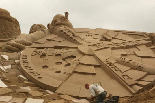 Shrek se asoma al fondo de la imagen, en el festival de Zeebrugge (Bélgica), donde se presentan algunas de las esculturas más grandes del mundo.