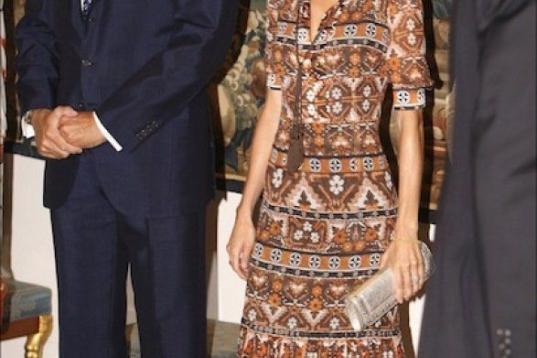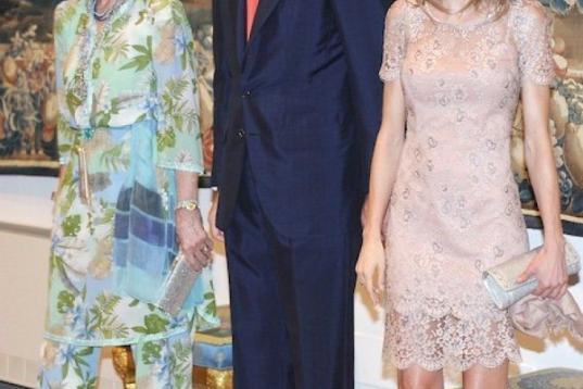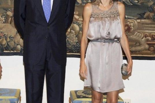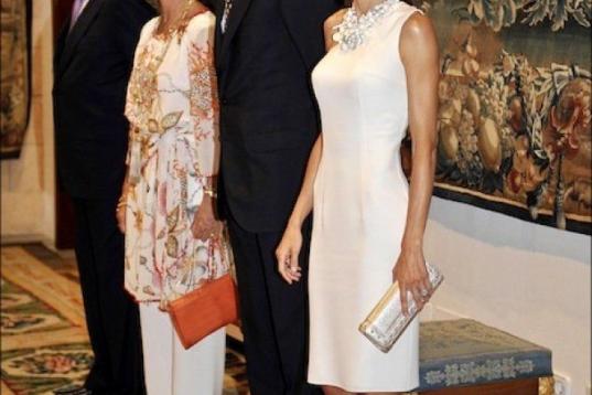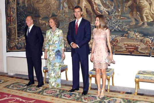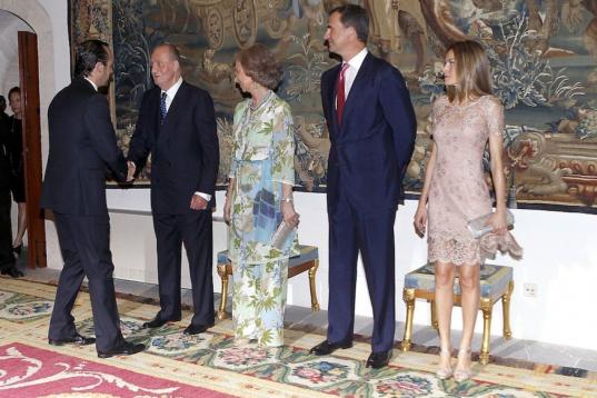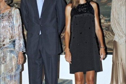 Uno de los momentos protocolariamente más complicados del año para la princesa Letizia es la cena que todos los veranos ofrecen los reyes a las autoridades de Baleares en el Palacio de la Almudaina de Palma de Mallorca: las mujeres de la familia real deben ir formales... pero veraniegas, que al fin y al cabo están en Mallorca. La reina, por ejemplo, suele salir airosa con vaporosos conjuntos floreados. Pero el estilo de Letizia es distinto. Ayer, la princesa de Asturias optó por un traje de encaje de Felipe Varela con truco. Llevaba una minifalda "encubierta": si se observa con atención el encaje, la transparencia llega muy arriba. Un error con el maquillaje sumado al bronceado veraniego hacía que su cuello apareciera demasiado blanco en comparación con la cara. Letizia acompañó el vestido corto con complementos que provocaban destellos plateados: sus sandalias, su bolso, un ribete en el cuello del traje y pendientes de aro.