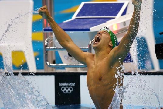 Por una brazada, Michael Phelps, el deportista que en Londres 2012 se ha convertido en el más laureado de la historia de los Juegos Olímpicos, se quedó sin el oro. Esta fue la emocionante celebración del sudafricano, Chad le Clos. | Getty