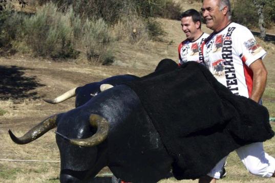 Sergio Gonzalo (i) y José Santos (d), integrantes del Grupo Arte Charro que ofrece espectáculos de Encierros de Carretones, durante el encierro celebrado en Ciudad Rodrigo. Ante la falta de presupuesto en los municipios que impide la organizac...