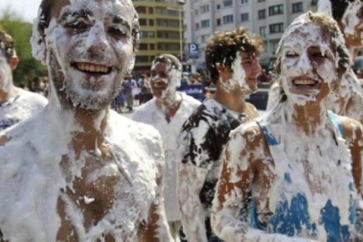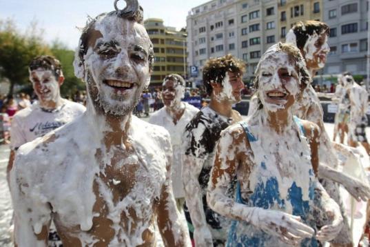 Un grupo de jóvenes participa en la guerra de merengue celebrada en la playa de la Zurriola de San Sebastián dentro de la programación de las fiestas de Semana Grande donostiarra, a mediados de agosto.