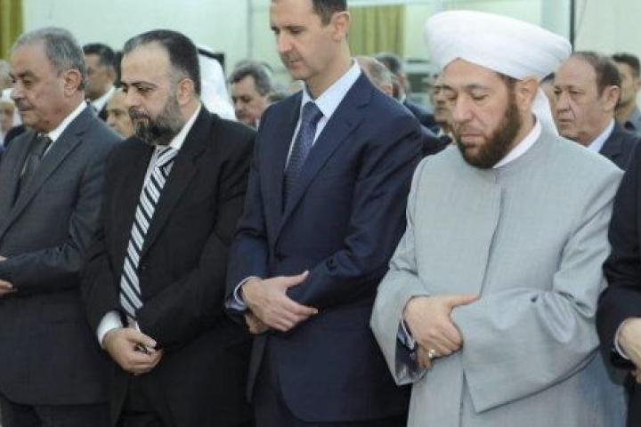 Las imágenes difundidas por la televisión estatal mostraron al mandatario sirio en la primera fila de decenas responsables y ciudadanos sirios escuchando junto al mufti del país, Ahmed Hasun, el sermón del imán.