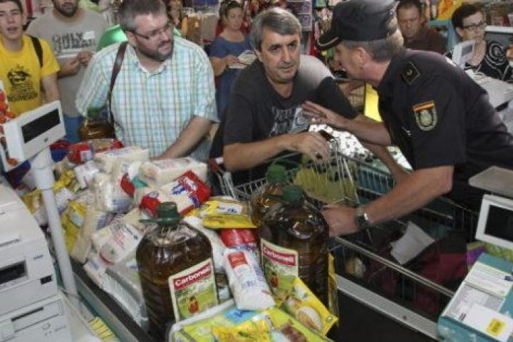 Los manifestantes, que han emulado la acción del Sindicato Andaluz de Trabajadores (SAT) registrada a principios de agosto en Écija (Sevilla) y Arcos de la Frontera (Cádiz), han coreado lemas como "el pueblo unido, jamás será vencido", que han sido repetidos también por los consumidores que a esa hora se encontraban en el centro, según un testigo de la acción.