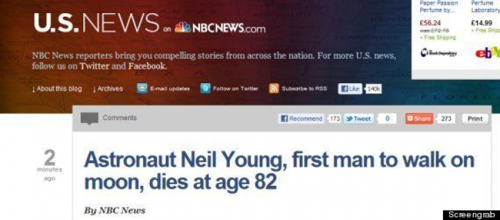 El más llamativo y clamoroso fallo fue el de la cadena estadounidense NBC, que publicó en su página web la muerte de Neil Young, icono de la música rock, confundiéndole con el astronauta. El titular erróneo fue el siguiente: "El astronauta Neil Young, primer hombre en pisar la Luna, muere a los 82 años".