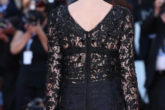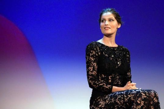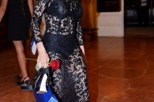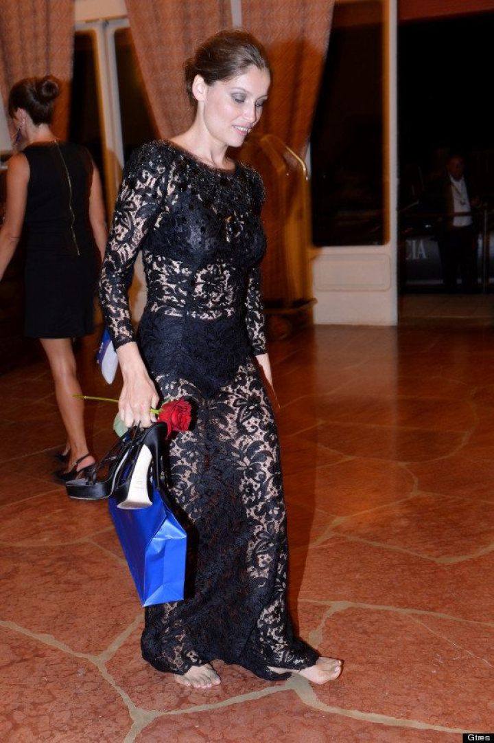 La alfombra roja del Festival de Vencia 2012 fue pisada en la ceremonia inaugural por la elegancia de Laetitia Casta: con transparencias de arriba abajo, en negro, en un vestido solo tupido en las zonas de la ropa interior y calzada en unos taconazos con los que no aguantó la noche entera. Acabo así, como si fuera un final de boda, con los zapatos cogidos en una mano (detalle: también agarraba una rosa roja) y caminando descalza.