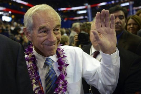 El candidato republicano Ron Paul saluda a partidarios en el Tampa Bay Times Forum en Tampa.