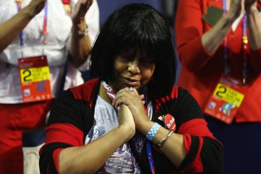 Una mujer inclina su cabeza durante la Convención Nacional Republicana.