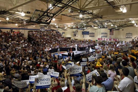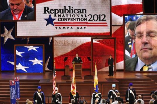El público asistente observa un video del candidato a la presidencia de EE.UU., Mitt Romney, durante la Convención Nacional Republicana