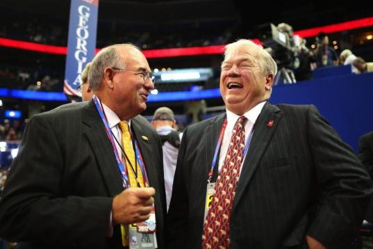 Alec Poitevint habla animadamente con el ex gobernador de Mississippi Haley Barbour (R) durante la Convención Nacional Republicana