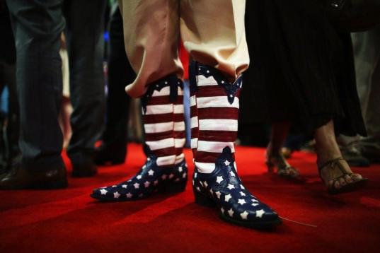 El delegado Don Genhart lleva unas patrióticas botas de cowboy durante la convención.